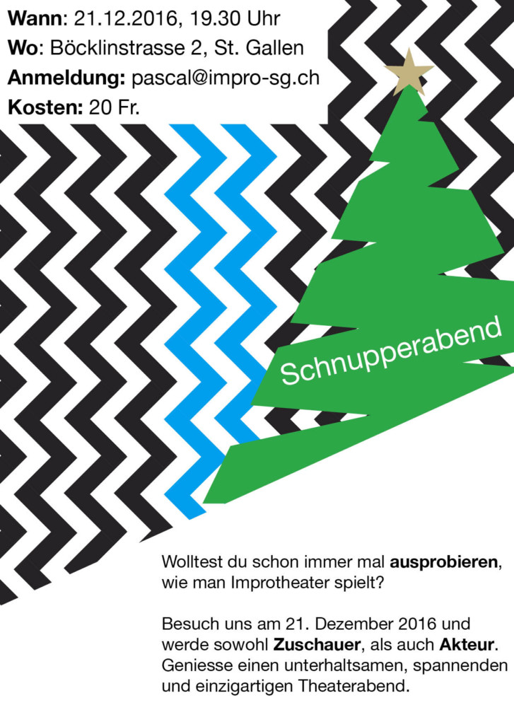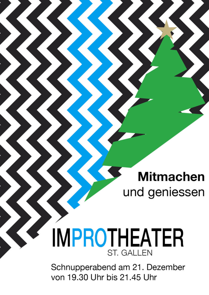 Wir geben Dir dazu die Gelegenheit. Melde dich an und schau am 21. Dezember bei uns vorbei. Erlebe in einem abwechslungsreichen Abend, was es heisst Improtheater zu spielen.